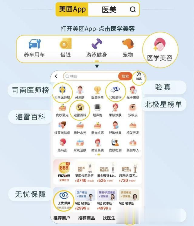 今年5月,美团进一步推出“放心美·无忧保障”,优化用户体验。同时,还推出“北极星机构榜”、“司南医师榜”等权威榜单,“避雷针”等产品功能,协助用户在医美消费上进行选择、比较和决策。